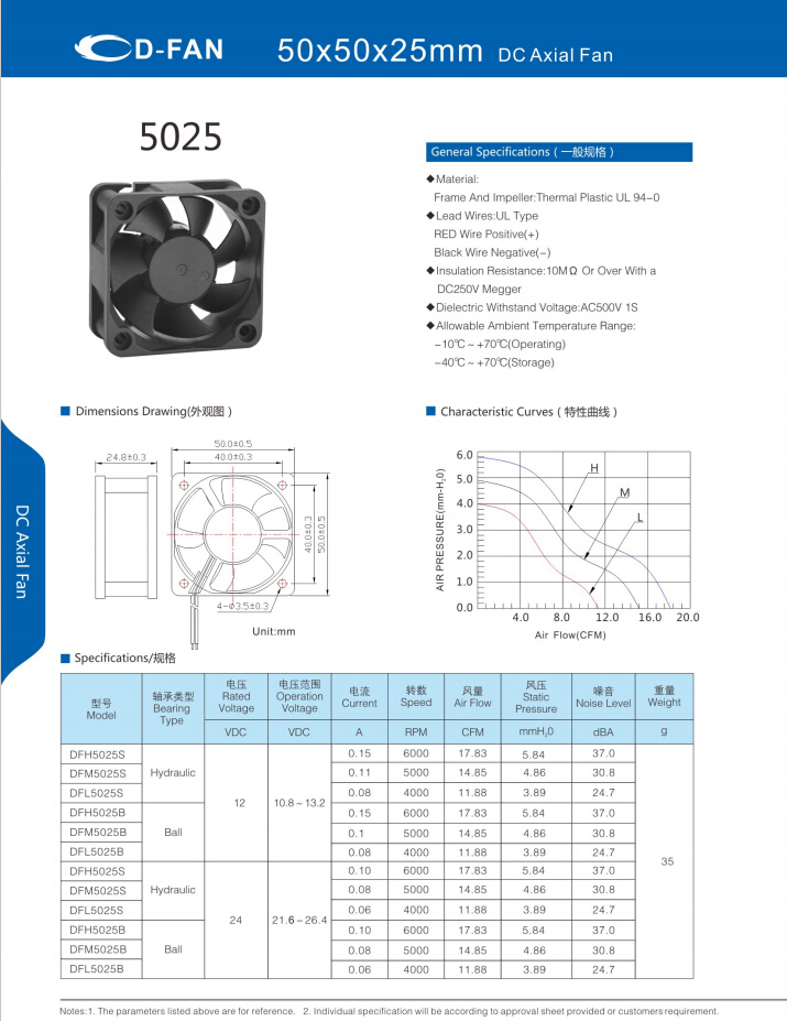 材料: 框架和葉輪:熱塑UL 94-0 引線.UL類型 紅色導線正極(+) 黑線負極(-) 絕緣電阻:10MΩ或以上,帶DC250V高阻表 介電耐壓:AC500V 1S 允許環(huán)境溫度范圍: -10℃-+70℃(運行) -40℃-+70℃(儲存)